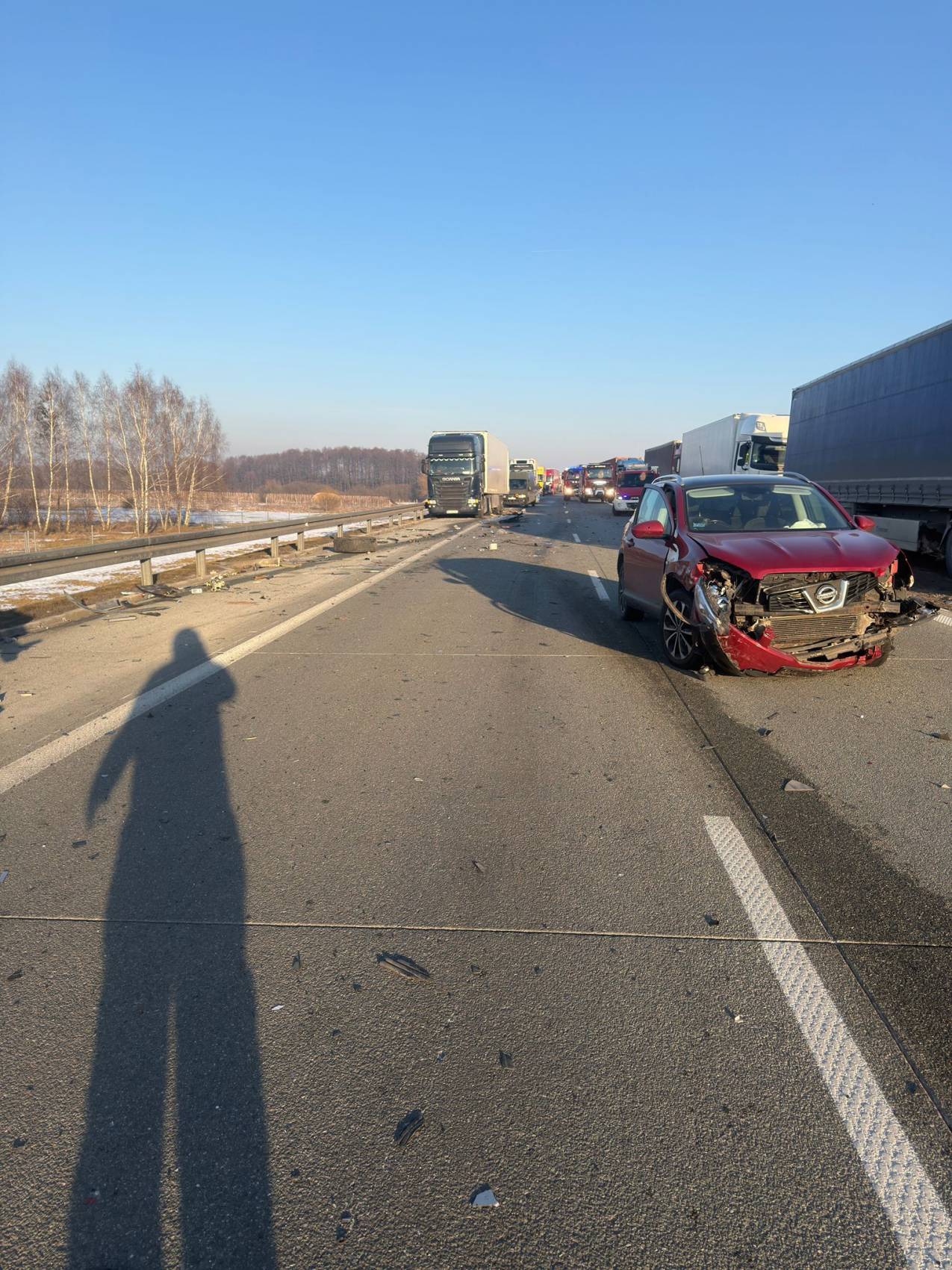 Jak wynika ze wstępnych ustaleń, 39-letni kierujący pojazdem ciężarowym marki Volvo z naczepą najechał na tył unieruchomionego na poboczu pojazdu ciężarowego marki Scania z naczepą. Scanią kierował 23-letni mieszkaniec powiatu sochaczewskiego.
