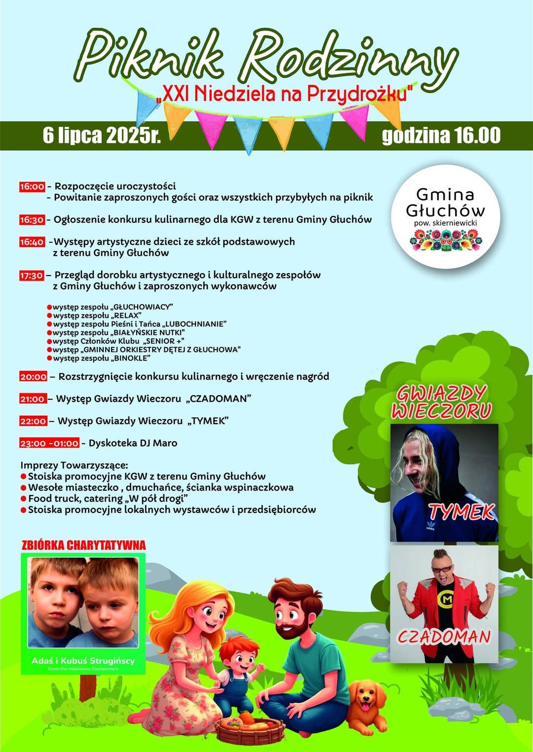 Boisko przy Szkole Podstawowej w Głuchowie dziś zamienia się w centrum rodzinnej zabawy. W programie występy uczniów i zespołów regionalnych, konkurs kulinarny Kół Gospodyń Wiejskich (rozstrzygnięcie o 20:00), a wieczorem – koncerty gwiazd: Czadoman o 21:00, Tymek o 22:00, a po nich dyskoteka z DJ Maro do 1:00 w nocy.