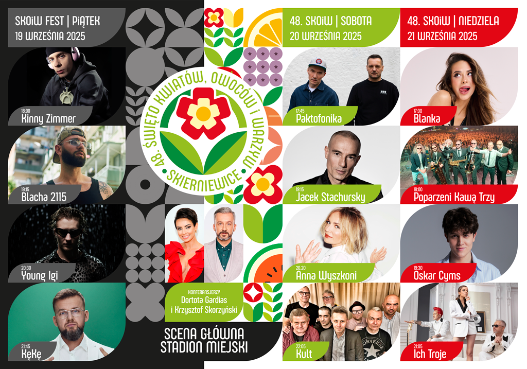 Poznaliśmy oficjalny line-up i godziny koncertów 48. Święta Kwiatów, Owoców i Warzyw w Skierniewicach! Od 19 do 21 września miasto znów rozbrzmi muzyką - przed nami koncerty gwiazd, taneczne rytmy i święto, które łączy pokolenia.