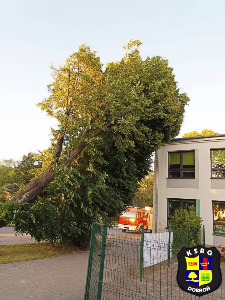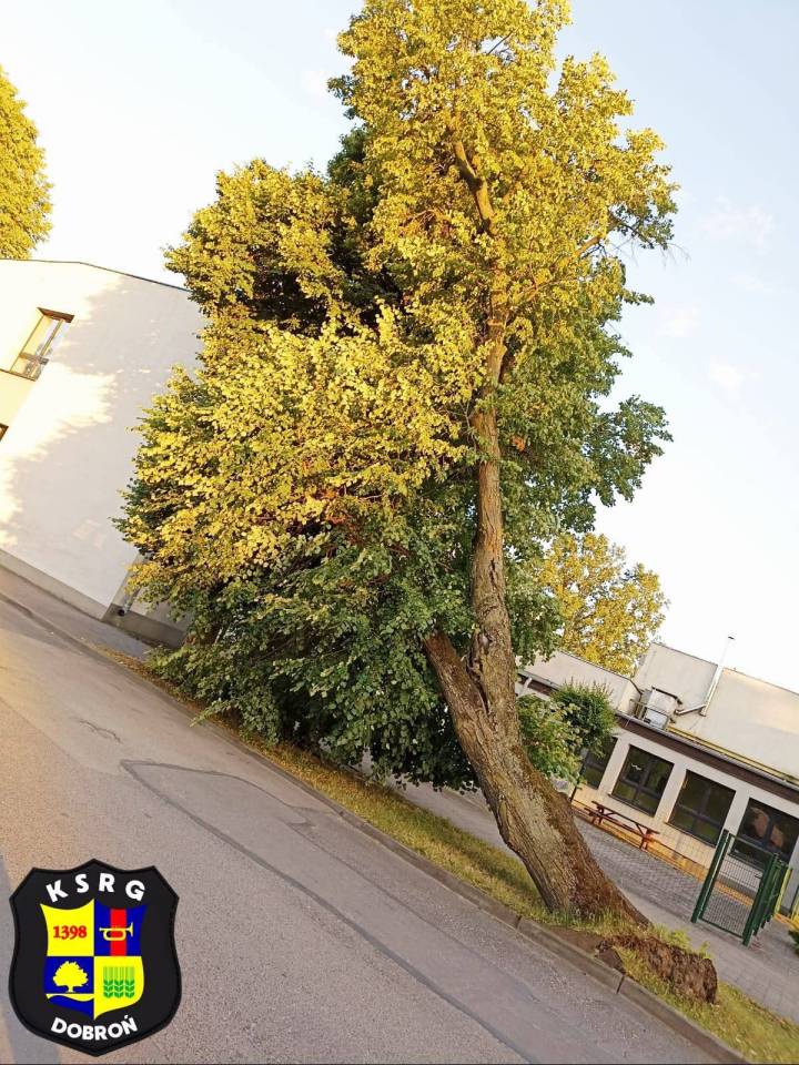 W czwartek, 19 czerwca, jednostki straży pożarnej z lokalnej OSP, a także pabianickiej straży pożarnej zostały zadysponowane do miejscowości Dobroń. Powodem interwencji było niebezpiecznie pochylone drzewo przy ulicy Witosa, w bezpośrednim sąsiedztwie Szkoły Podstawowej. Zdarzenie stwarzało realne zagrożenie dla bezpieczeństwa - szczęśliwie w dniu wolnym w placówce nie było uczniów czy personelu szkoły, a i ruch przechodniów był znacząco ograniczony.