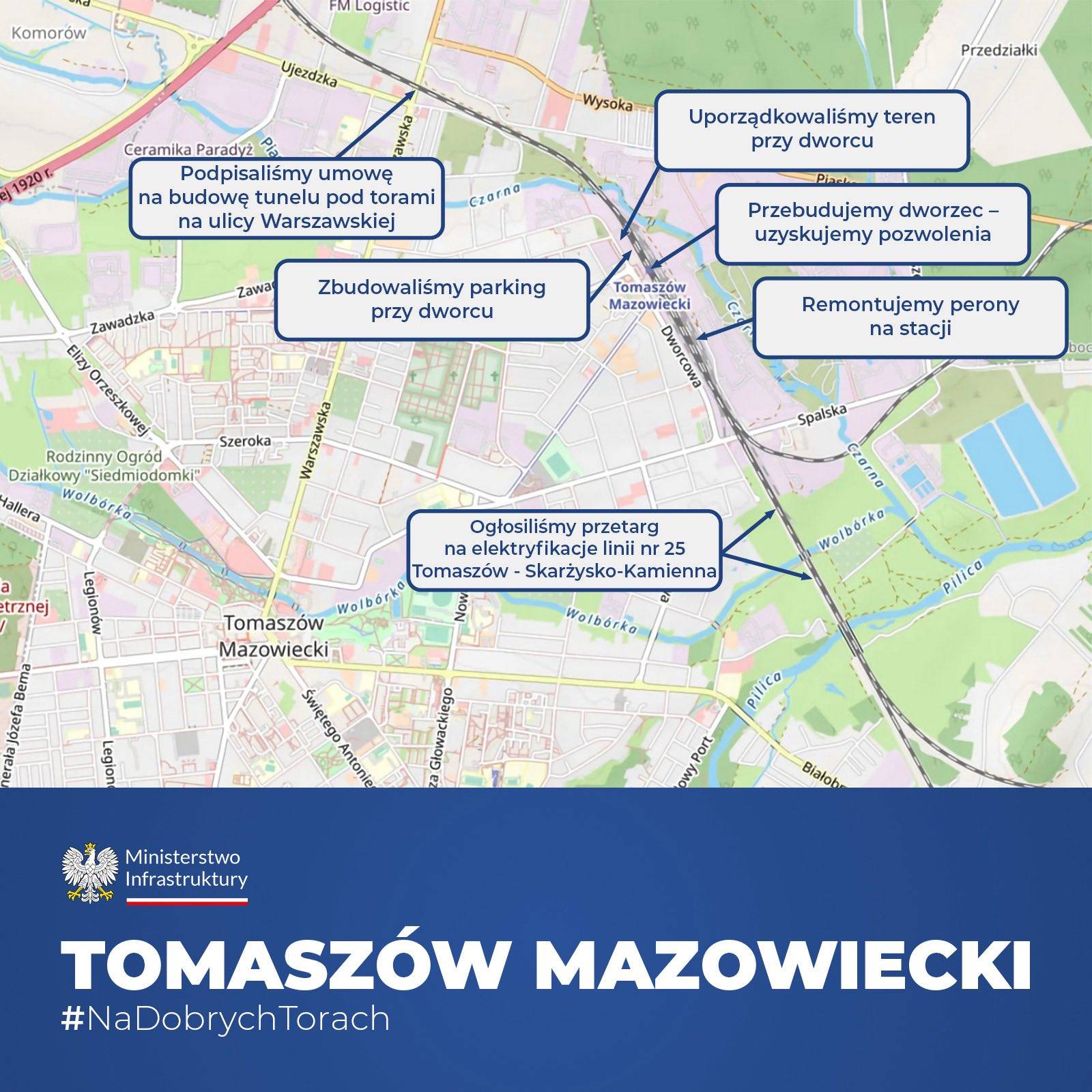 Zakres prac w Tomaszowie Mazowieckim jest szeroki. Oprócz budowy tunelu drogowego powstanie nowy wiadukt kolejowy nad obiektem. Przebudowany zostanie również układ drogowy w sąsiedztwie inwestycji. W planach jest budowa ronda, nowych ulic oraz skrzyżowań, co całkowicie zmieni organizację ruchu w tej części miasta i poprawi komunikację pomiędzy osiedlami.