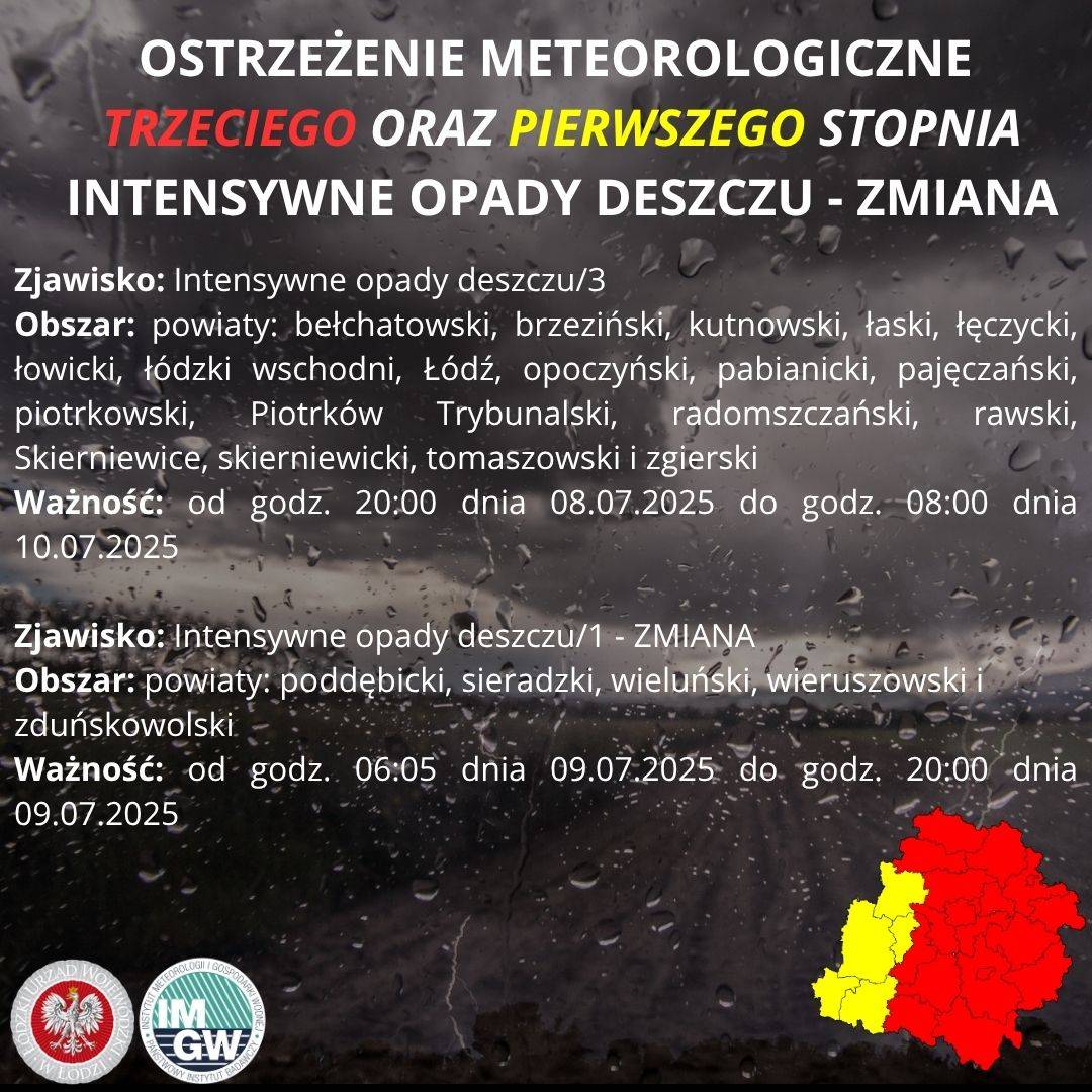 Niższym, I stopniem ostrzeżenia objęte zostały powiaty:poddębicki, sieradzki, wieluński, wieruszowski, zduńskowolski. W tym przypadku alert żółty wydano do godziny 20:00 dnia 9 lipca. W tych rejonach prognozowana suma opadów to 20–45 mm; opady umiarkowane i przelotne.