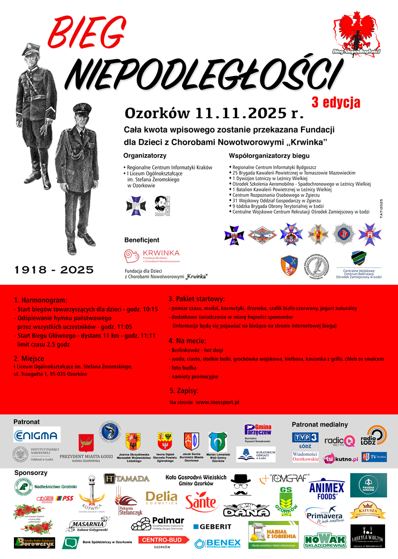 Już 11 listopada w imieniu organizatorów zapraszamy wszystkich mieszkańców gminy Ozorków oraz okolic do wspólnego świętowania Narodowego Święta Niepodległości w sportowym duchu! Nie bez znaczenia jest też charytatywny wymiar imprezy, cała bowiem kwota wpisowego zostanie przekazana Fundacji dla Dzieci z Chorobami Nowotworowymi "Krwinka"
